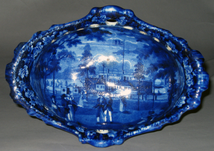 This is an oval ceramic dish with an everted rim that rises and falls gently, a rounded body, and a slightly contracted base. The rim forms soft waves, beneath which runs a row of evenly spaced circular perforations. Using the transfer-printing technique, blue designs depict a harbor scene of Castle Garden at the center, flanked by neoclassical buildings on both sides. The surface feels smooth and cool to the touch, the side walls are firm and thick, and several tiny glaze pops on the base feel like coarse grains of salt. When lightly tapped, the dish emits a short, muted tone.