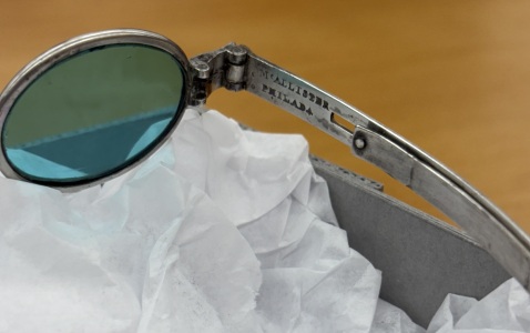 A small pair of silver-framed spectacles sits nestled in a box filled with white tissue paper. Its lenses are small, oval, and tinted, coloring the world seen through them a shocking, icy blue. They connect via a thin, curved bridge for the nose, with two silver arms jutting from either side of the spectacles. The left arm bears the inscription “McALLISTER PHILADA.” Two pieces of metal compose the arms, one sitting within the other on a rail, allowing for extension. At the end of each arm, there are also teardrop-shaped holes. The silver frame gleams under the fluorescent lighting, with only a hint of tarnish; the lenses are lightly chipped where they meet the frames, reflecting the years of use.